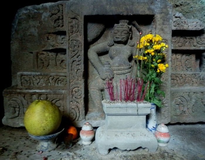Bước vào miếu Linh Động Chơn Tiên qua một vòm đá tự nhiên, du khách sẽ chứng kiến 3 gian với tượng nữ thần Linh Sơn Thánh Mẫu được chế tác từ đá sa thạch nâu xám, mang đậm phong cách nghệ thuật Chăm Pa.