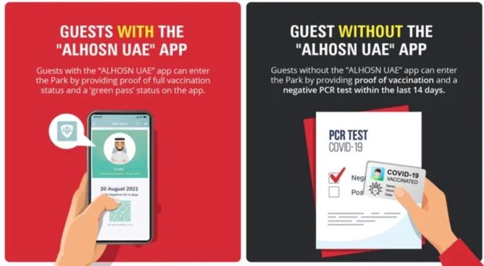 - Du khách và người không phải cư dân UAE không sử dụng ứng dụng Alhosn cần cung cấp bằng chứng về việc được tiêm chủng đầy đủ và kết quả xét nghiệm RT-PCR âm tính trong vòng 14 ngày.