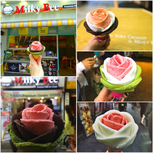 Kem mật ong phủ kem Milky Bee được tạo hình thành một bông hoa hồng đặc biệt với 4 hương vị hoàn hảo: dâu tây, socola, sữa chua, trà xanh. Tin rằng, bạn sẽ không thể nào chịu đựng được để ăn cây kem dễ thương này. Mặc dù vậy, hương vị độc đáo của cây kem này cũng thu hút giới trẻ Seoul, vì thế trước khi thưởng thức món kem đặc biệt này, hãy chắc chắn bạn đã chuẩn bị sẵn sàng trước máy ảnh nhé!