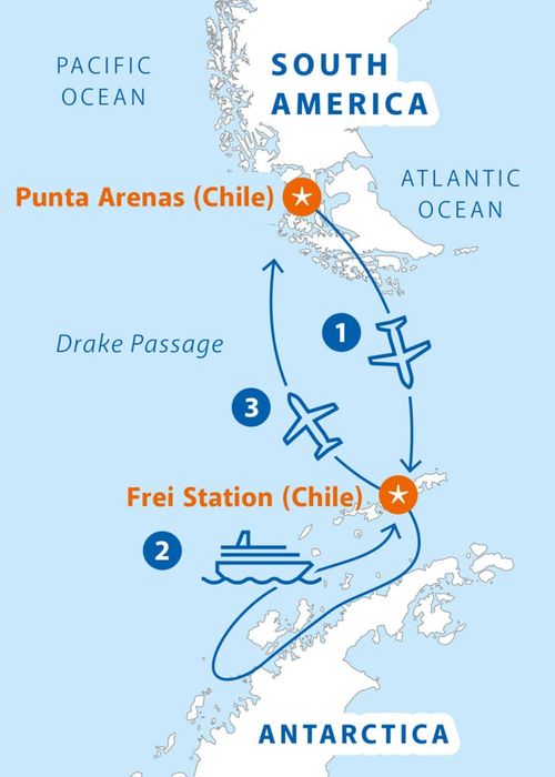 Khi bước ra khỏi máy bay, bạn sẽ cảm nhận được làn gió trong lành của Nam Cực. Trước khi lên tàu Ocean Nova khám phá vùng đất này, hãy dừng chân để ngắm nhìn nhà ga Frei và nhà ga Bellingshausen, là hai trong những nhà ga quan trọng tại Nam Cực.