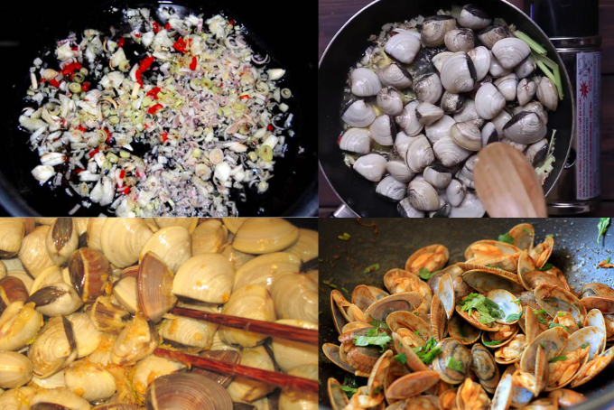 - Đặt chảo lên bếp, đun nóng và thêm một ít dầu, bơ, sả, tỏi, và ớt băm nhuyễn vào xào cho thơm, đến khi thấy các nguyên liệu này chuyển sang màu vàng thì thêm nghêu vào xào chung.