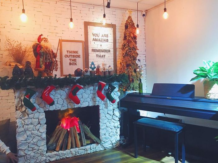Bên cạnh lò sưởi, cây đàn Piano tạo ra không gian ấm áp và sang trọng, phản ánh bầu không khí của đêm Giáng sinh.