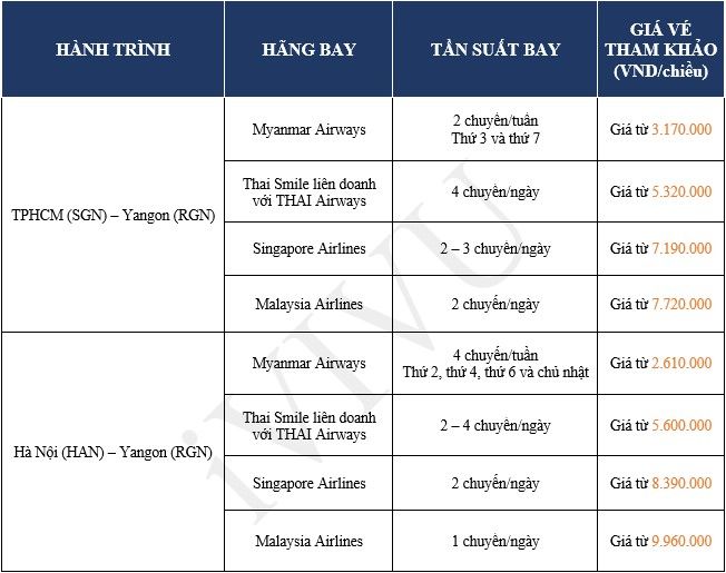 *Tham khảo lịch bay và giá vé cho chuyến bay Việt Nam – Yangon trong bảng dưới:
