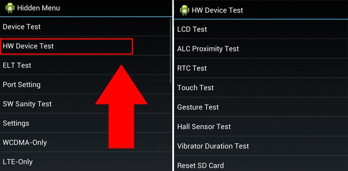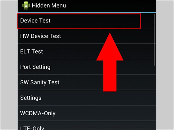 Nhập mã kiểm tra 3845#*mã máy# hoặc *#546368#*mã máy# trên bàn phím trong ứng dụng Điện thoại > Sau đó, giao diện Hidden Menu hiện ra, bạn chọn Device Test.