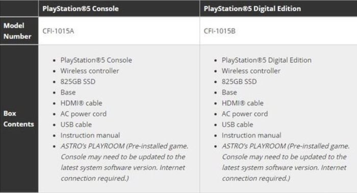 Cả hai phiên bản PS5 và PS5 Digital Edition đều có cấu hình tương tự, từ chip xử lý CPU, GPU, dung lượng RAM, băng thông bộ nhớ đến ổ cứng SSD. Điểm khác biệt duy nhất nằm ở việc PS5 Digital Edition không tích hợp ổ đĩa UltraHD BluRay, phù hợp cho những người muốn trải nghiệm game không đĩa hoặc xem phim 4K BluRay.Dưới đây là bảng so sánh cấu hình giữa PS5, PS5 Digital Edition, Xbox Series X và Xbox Series S để anh em dễ dàng thấy rõ sự khác biệt:Giá và Ngày phát hành