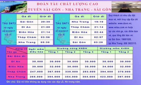 – Tàu SNT1 khởi hành từ Nha Trang vào lúc 19 giờ 10 phút và đến Sài Gòn vào lúc 03 giờ 28 phút.
