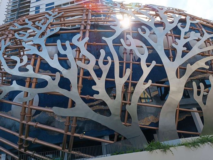Mặc dù đã chiêm ngưỡng hình ảnh nhà hát trước đó, nhưng trải nghiệm trực tiếp vẫn khiến tôi kinh ngạc trước vẻ tinh tế của kiến trúc. Đây là một tác phẩm nghệ thuật độc đáo, với khung bên ngoài mô phỏng hình dạng chiếc đò, ôm sát lấy khối nhà bên trong. Màu sơn của khung phản ánh đúng với màu tre khô truyền thống, tạo nên một tương phản độc đáo. Trên phần thân của công trình, vật liệu mỏng màu sáng được sử dụng để tạo ra hình ảnh những nhánh san hô, với ngọc trai lung linh lấp lánh. Để tận hưởng hết vẻ đẹp của nhà hát Đó, nên chụp ảnh từ góc độ lệch khoảng 45 độ so với mặt tiền chính.