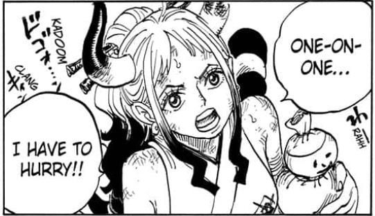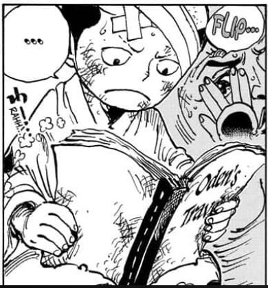 Trốn ở một nơi an toàn, Momonosuke hiện tại đã có đủ thời gian để đọc cuốn nhật ký của Oden. Ta có thể thấy khuôn mặt của Shinobu phía sau đang tỏ ra rất hoảng hốt, có lẽ trong những chap tới sẽ có những bí ẩn về khoảng thời gian Oden ở Wano được tiết lộ qua cuốn nhật ký này, cũng như những dự đoán của vợ chồng Oden về tương lai.