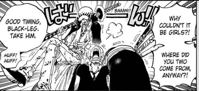 Nhờ có kinh nghiệm làm bồi bàn lâu năm, cách Sanji 'bắt' 2 người cũng khá điệu nghệ, giống như việc bắt đĩa đồ ăn cả, kèm theo chiếc áo choàng của Law như một chiếc giẻ lau bàn.