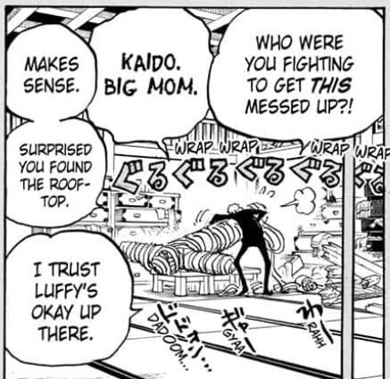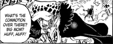 Tương tự như Kid, ngay sau khi rơi xuống đất, Law ngay lập tức theo đuổi Zeus và đi tìm Big Mom với mục đích ngăn cản bà ta hội họp lại với Kaido. Cho dù chưa biết kết quả ở trên nóc nhà như thế nào, có thể nói cả Kid và Law đều rất tin tưởng vào Luffy.