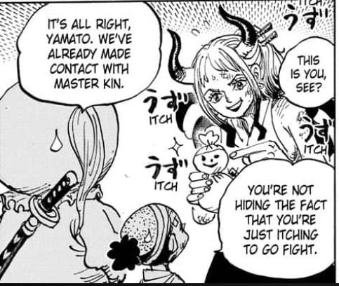 Trong phần trước, tôi đã tóm tắt phương hướng và tình hình của các thành viên trong nhóm Xích Sao tính đến hiện tại. Phần này, chúng ta tiếp tục quay lại với các diễn biến khác trên đảo. Đầu tiên là nhóm Yamato. Shinobu hiện tại đã liên lạc được với Kinemon, do đó Yamato quyết định rời đi để làm 'mồi nhử'. Thế nhưng thực tế là anh ta chỉ muốn đi đánh nhau mà thôi. Bạn có thể thấy xung quanh Yamato là tiếng ngứa ngáy, nôn nao, là một trò đùa của Oda khi nó cũng chính là tên của chap 1012.