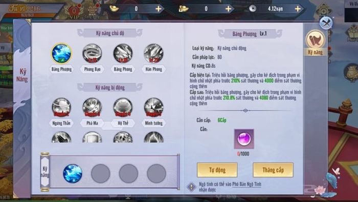 Kỹ Năng Chủ Động bao gồm 4 kỹ năng chính, mạnh mẽ và chỉ được kích hoạt khi người chơi mong muốn, có thể nâng cấp để tăng cường sức mạnh.