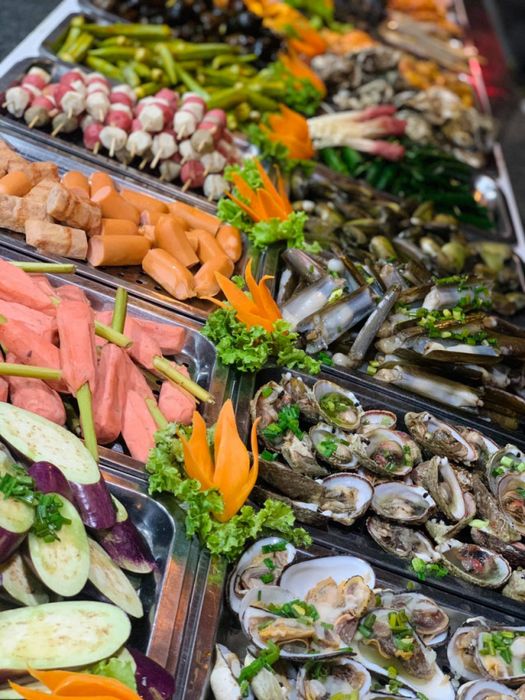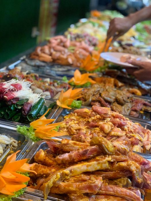 Để bữa tiệc BBQ không bao giờ ngừng, nhà hàng sắp xếp đầy ắp những khay đồ ăn khổng lồ với thịt ướp sốt và hải sản tươi ngon. Nhân viên luôn sẵn lòng bổ sung để đảm bảo khách hàng luôn có những món ưa thích. Cùng gia đình và bạn bè thưởng thức không khí vui vẻ bên bàn nướng phong cách. Đồng thời, quán còn cung cấp các món chín như mỳ hải sản, cơm rang, súp, bò sốt vang và trái cây tươi ngon cho tráng miệng.