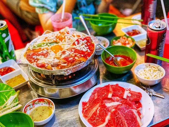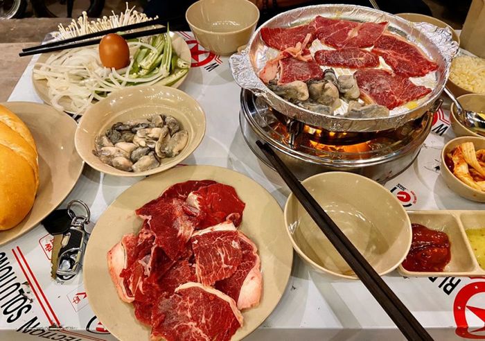Dive into the unique experience at Bò Sốt Hẻm. Savor the special beef and cheese sauce, and the succulent oyster and cheese sauce combo. The combo, starting from 169,000 VND, offers a table for 2-3 people, making it extremely affordable. Enjoy high-quality American beef, fresh oysters, and crispy squid with a spicy, creamy sauce. The restaurant also adds kimchi, enoki mushrooms, cucumbers, and eggs to enhance the dining experience. The spicy and flavorful combination with the richness of cheese, beef, squid, and oysters is truly exquisite. It's a perfect place for a delightful evening with friends and family.