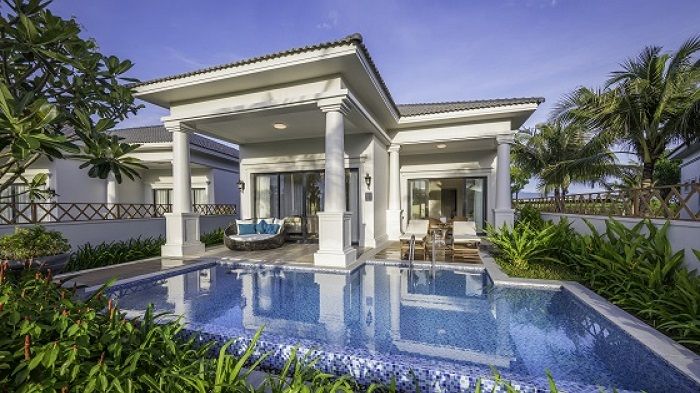 Phòng nghỉ được thiết kế theo phong cách tân cổ điển Châu Âu hiện đại, đầy đủ tiện nghi để đáp ứng mọi nhu cầu. Ngoài ra, resort còn có bể bơi, hồ nước xanh biếc, vườn nhiệt đới, nhà hàng và quầy bar, mang đến trải nghiệm độc đáo cho chuyến đi khám phá Tứ Bình Nha Trang.