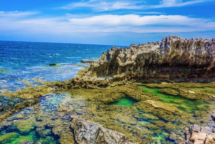 Vùng biển ở đây vẫn giữ được sự hoang sơ, trong lành, mang đến cảm giác thư thái và yên bình cho du khách. Sự hòa quyện giữa màu trắng của đá vôi, màu xanh lam của trời và biển, màu vàng của nắng tạo nên khung cảnh trữ tình và thơ mộng.