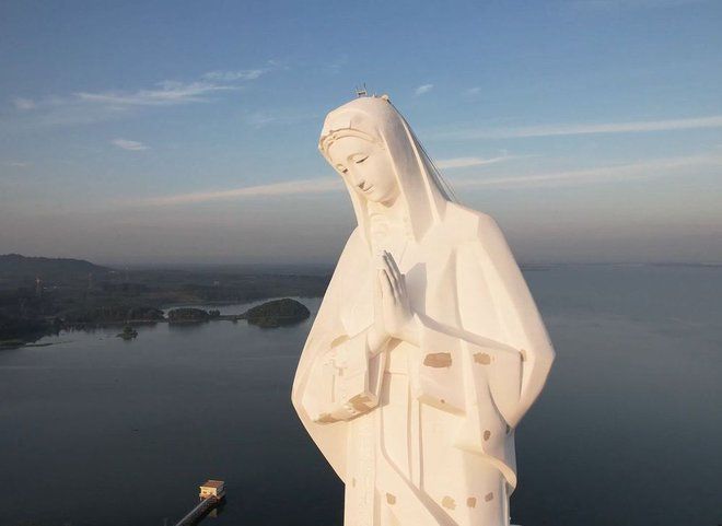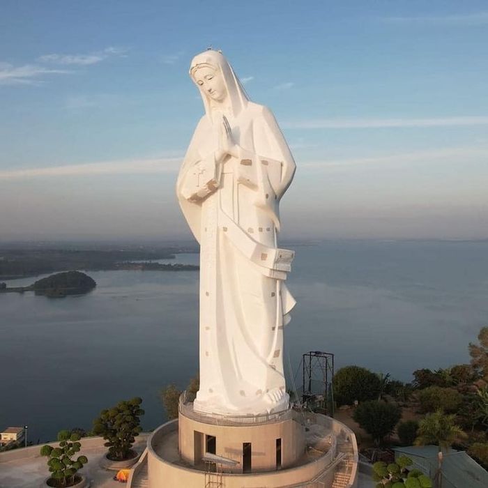 Tượng Đức Mẹ Maria đứng trên đỉnh Núi Cúi, phía sau là lòng hồ Trị An rộng lớn, với ánh mắt hướng về giáo phận Xuân Lộc, Đồng Nai.