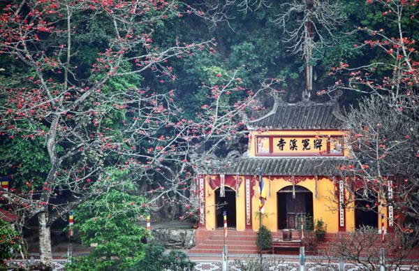 Vào thời điểm này, hoa gạo nở rực rỡ nhất, du khách có thể ngồi trên thuyền ngắm nhìn những cánh hoa gạo nở trên hai bên bờ, hoặc đi trên cáp treo để ngắm nhìn những cánh hoa gạo đỏ rực trước chùa Giải Oan...