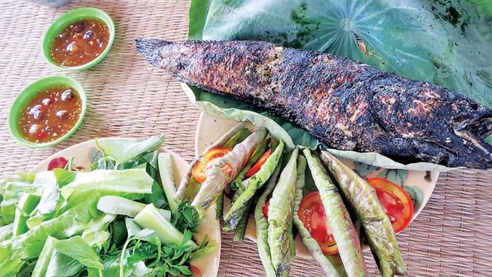 Cá lóc nướng trui, kèm rau từ vườn nhà