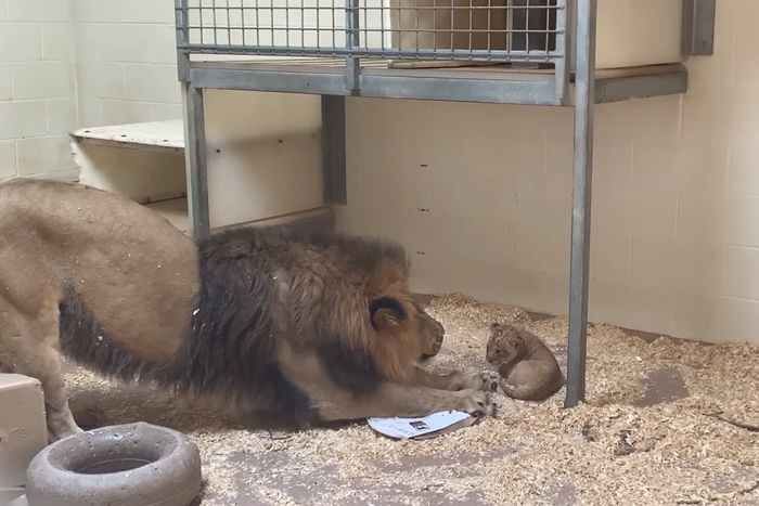 Chơi đùa gia đình: Sư tử bố vui chơi cùng sư tử con tại trung tâm chăm sóc
