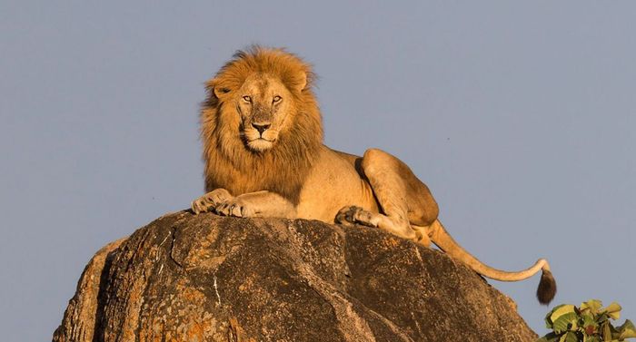 Sư tử nằm im trên đỉnh tảng đá, bóng dáng mạnh mẽ tỏa ra vẻ đẹp hoang dã