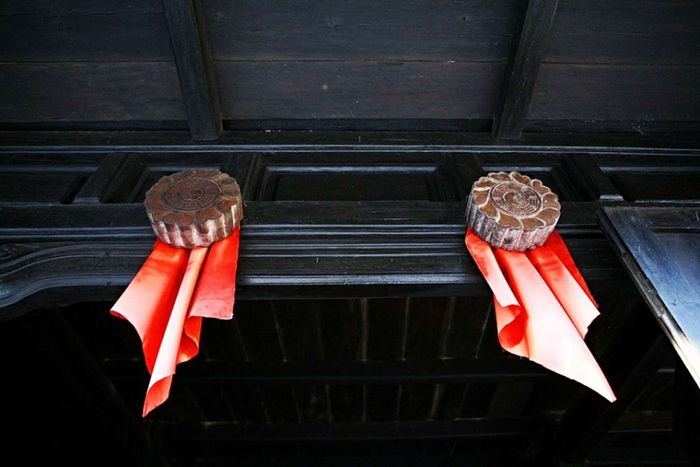 Vượt qua cánh cửa, bức hoành phi 4 chữ “Thế Đức Lưu Quang” tỏa sáng. Ý nghĩa về đức hạnh tổ tiên được kế thừa, cặp đối cổ ý nghĩa. Nhà có 80 cột gỗ lim cứng cáp, đặt lên chân đá chống hư hại.