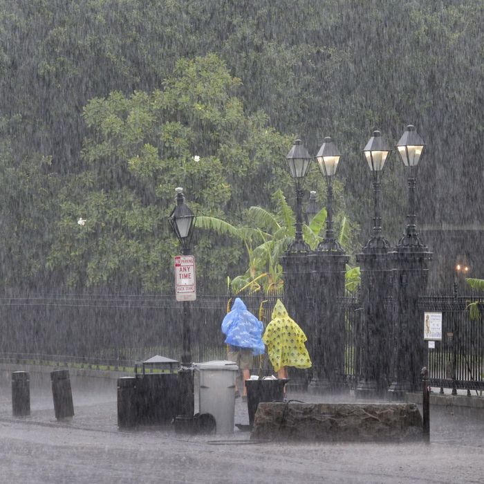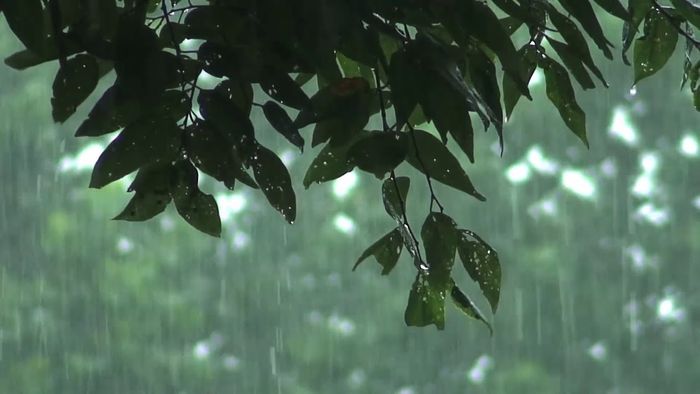 Mưa rơi nặng hạt bên ngoài tán lá, làm nhấn chìm thành phố