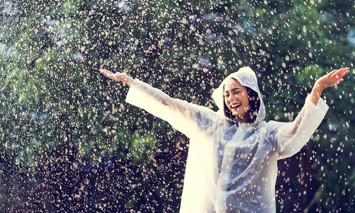 Người phụ nữ vui vẻ đùa giỡn dưới làn mưa nhẹ, tận hưởng niềm vui giản đơn