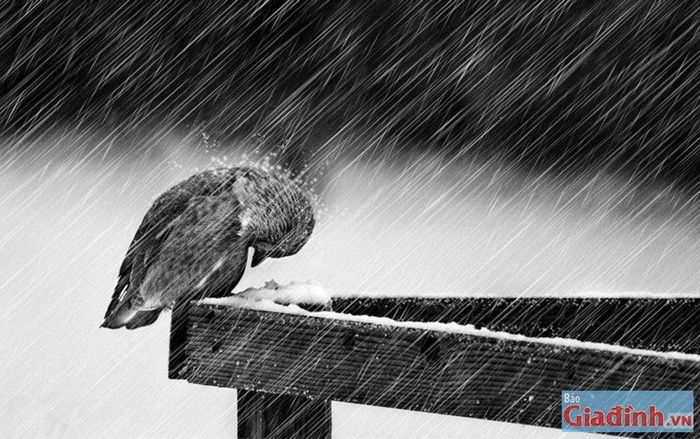 Chú chim buồn thấp thoáng dưới cơn mưa, ánh mắt đầy nỗi đau
