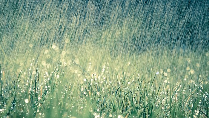 Mưa rơi trên thảm cỏ xanh, tạo nên bức tranh tự nhiên tươi mới và yên bình