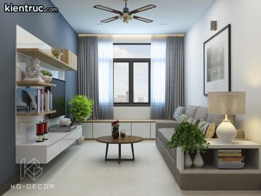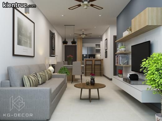 Thiết kế nội thất cho căn hộ nhỏ với tối giản và hiệu quả. Phòng này bao gồm sofa, bàn, tivi và kệ. Tivi treo trên tường tiết kiệm không gian, ánh sáng tự nhiên tạo hiệu ứng mở rộng không gian. Trang trí tối giản nhưng vẫn đáp ứng nhu cầu sử dụng và thẩm mỹ. Thiết kế chung cư 50m2 2 phòng ngủ được tính toán phù hợp từ phòng khách, phòng bếp đến các công trình phụ khác.