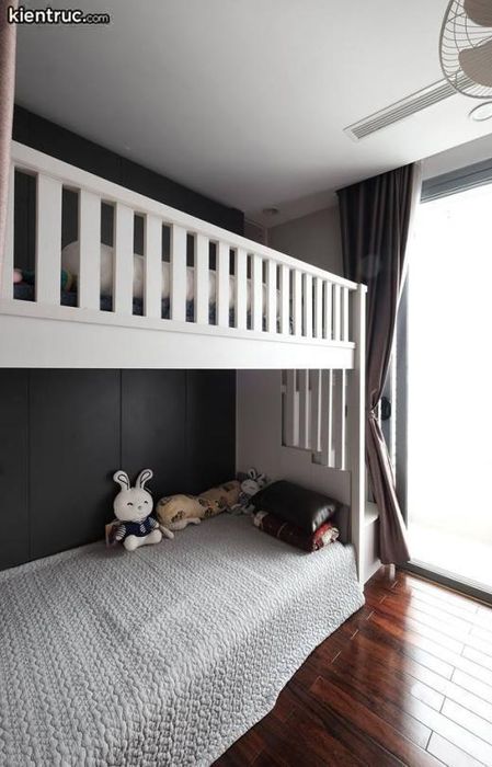 Bố trí nhà vệ sinh gần phòng trẻ em trong không gian nhỏ. Sử dụng giường tầng là lựa chọn tốt cho gia đình có 2 con nhỏ, tiết kiệm diện tích và đảm bảo không gian riêng tư cho bé. Giường tầng không quá cao, giúp bé dễ dàng trèo lên. Rèm cửa mềm mại che chắn ánh sáng, tạo điều kiện cho giấc ngủ ngon của bé.