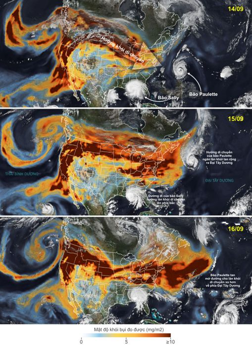Bạn đã từng tưởng tượng cảnh đám khói cháy rừng lớn đối mặt cùng lúc với 2 cơn bão nhiệt đới sẽ trông như thế nào chưa?Hình ảnh dưới đây được ghi lại bởi nhiều vệ tinh khác nhau của NASA, cho thấy cách mà những thảm họa tự nhiên này 'chạm mặt' nhau - khi hàng loạt đám khói từ cháy rừng Bờ Tây Mỹ lan tỏa và vô tình va chạm với 2 cơn bão nhiệt đới đang hình thành và tiến vào quốc gia.