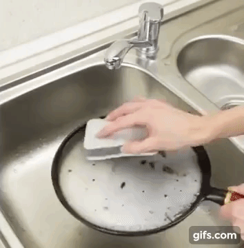 Tiếp theo, dùng mút rửa chén chà nhẹ nhàng, sau đó rửa lại bằng nước làm cho chảo trở nên sạch và không còn dầu mỡ ngay lập tức.
