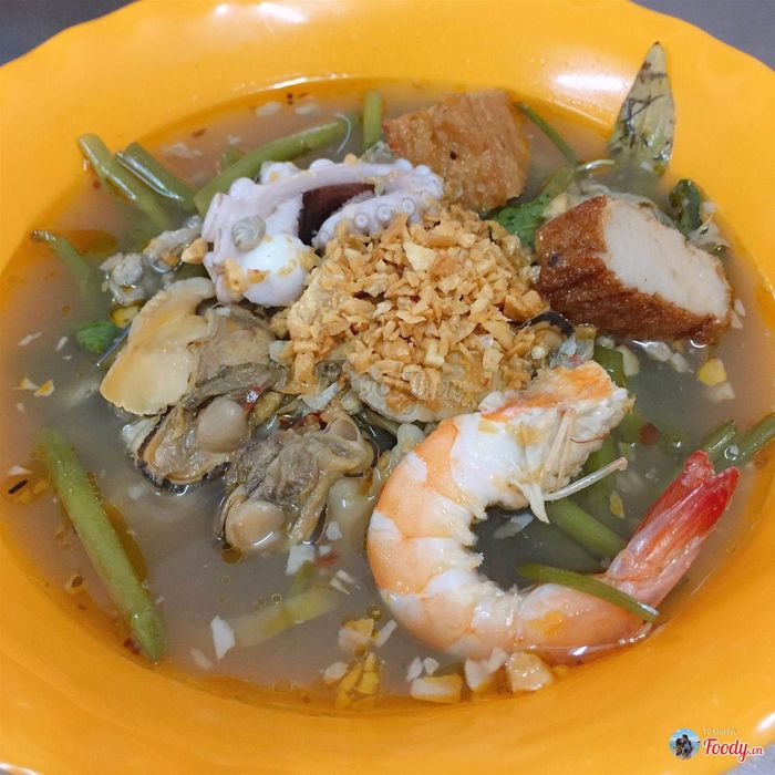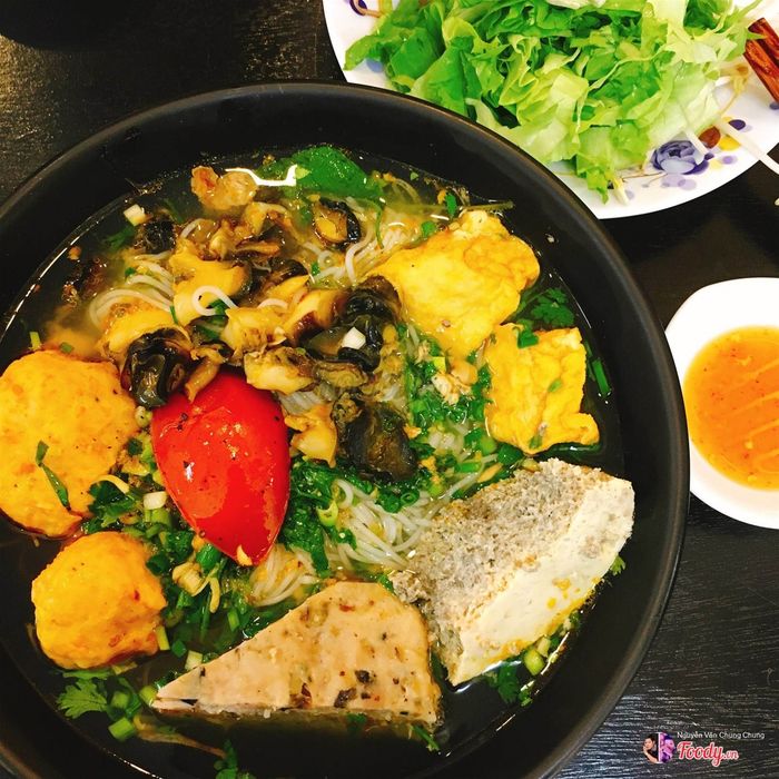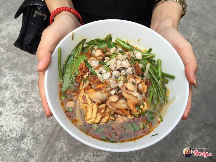 Đây là quán mì ốc hến có nhiều topping nhất ở Sài Gòn, tô đặc biệt thập cẩm với tôm, bạch tuộc, và chả nữa.