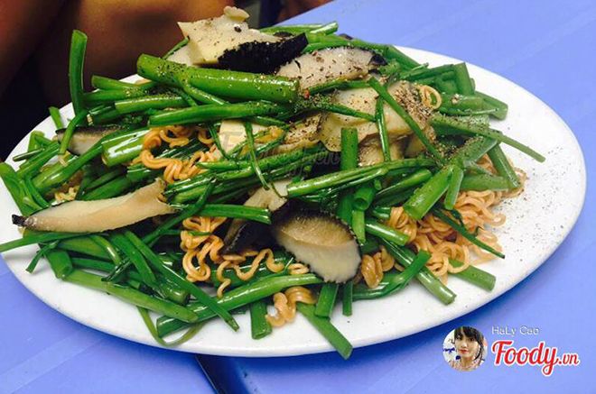 Ốc xào mì thường được ăn kèm với rau muống giòn giòn cực kỳ ngon miệng.