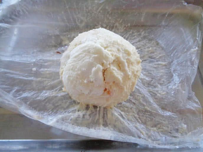 Tiếp theo, đặt viên kem vào màng thực phẩm, bọc chặt và đặt trở lại ngăn đá tủ lạnh để 2-3 tiếng.