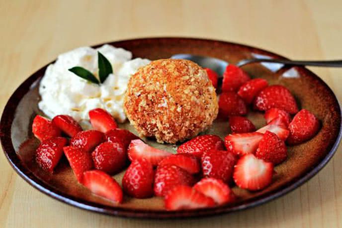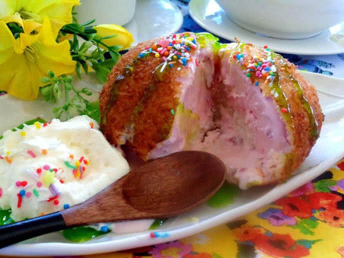 Chế biến: Kem chiên được đưa lên đĩa, trang trí thêm lớp kem tươi và rắc thêm đường màu để tạo vẻ đẹp và lôi cuốn hơn. Lớp vỏ ngoài của kem chiên cực kỳ giòn, trong khi kem bên trong vẫn giữ nguyên mà không bị chảy.