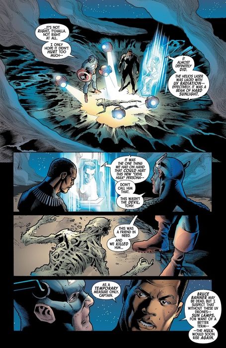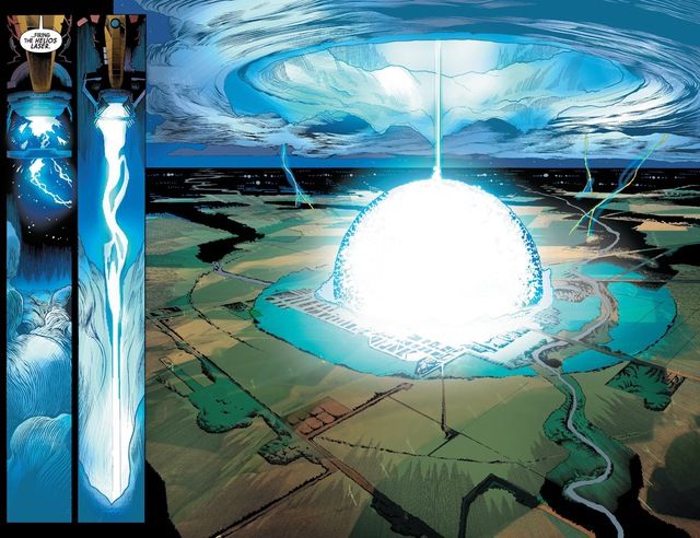 Laser Helios sử dụng tia UV, gây thiệt hại lớn và ngăn chặn Hulk phục hồi tạm thời. Mặc dù Hulk không chết vì là phiên bản Immortal Hulk, nhưng nếu không phải là Immortal Hulk, kết quả có lẽ khác đi rất nhiều.