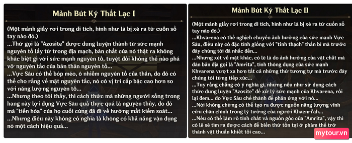 Mytour sẽ đưa bạn lại nhớ về thông điệp của những tờ giấy này. Một khoáng vật gọi là Azosite được tạo ra từ sức mạnh của Địa Mạch, đúng như sức mạnh nguyên tố. Trong khi đó, Vực Sâu có sức mạnh ở một 'đẳng cấp' cao hơn, có thể biến đổi và làm ô nhiễm nguyên tố của vị thần.