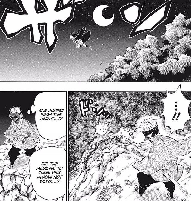 Cho đến chương 195, Nezuko đã băng qua núi cao trong 50 phút để đến chiến trường. Dường như thuốc biến quỷ thành người đang ảnh hưởng đến cô khi mắt trái đã trở lại. Chúng ta chưa biết Nezuko sẽ biến đổi ra sao.