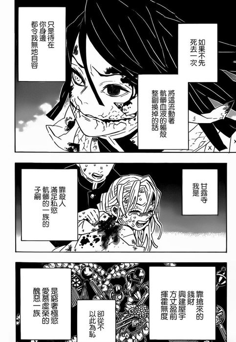 Bắt đầu chương, Muzan tiếp tục tấn công mạnh mẽ, khiến các Trụ không thể tiếp cận. Luyến Trụ, dù thiếu kinh nghiệm, bị thương nặng và không thể chiến đấu. Xà Trụ đưa cô đến được những thợ săn quỷ khác để chữa trị và quyết tâm đối đầu với Muzan.