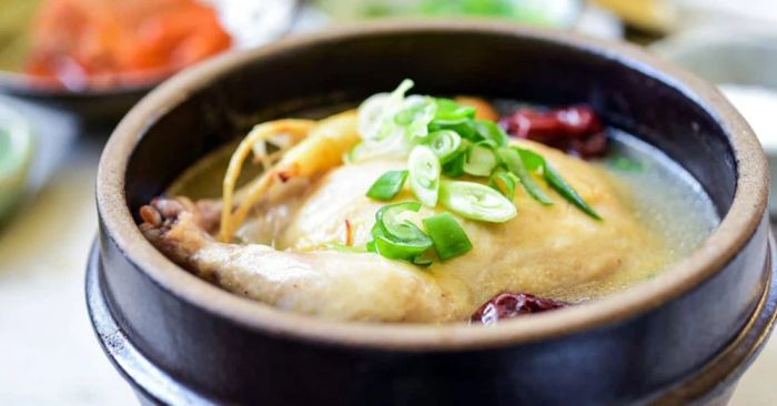 Nếu đến Hàn Quốc, hãy thử món súp gà nhân sâm Samgyetang. Thường xuất hiện nhiều vào mùa hè, được làm từ gà, nhân sâm, hành, tiêu, táo tàu... Món này rất giàu dinh dưỡng, tốt cho sức khỏe.