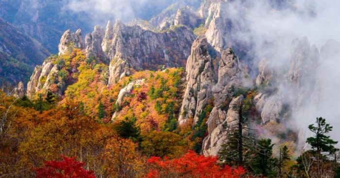 Công Viên Quốc Gia Seoraksan trở nên vô cùng đẹp vào mùa thu. Cảnh sắc ở Seoraksan vào mùa thu với cánh rừng màu cam đỏ rực rỡ, thời tiết se lạnh và cảm giác gió thổi nhẹ rất tuyệt vời để tản bộ. Ngoài ra, bạn cũng có thể ghé thăm Công Viên Quốc Gia Naejangsan để ngắm mùa thu và quan sát động vật.
