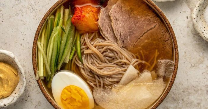 Mì lạnh kiểu Hàn Quốc là sợi mì mỏng, thêm thịt bò, trứng luộc, dưa chuột và lát lê Hàn Quốc. Có nhiều loại nguyên liệu tùy vào mì và khẩu vị từng vùng khác nhau.