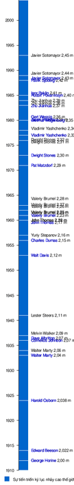 | 2,23 m (7 ft 3+3⁄4 in) | Valeriy Brumel (Liên Xô) | Moskva | 18 tháng 6 năm 1961 |