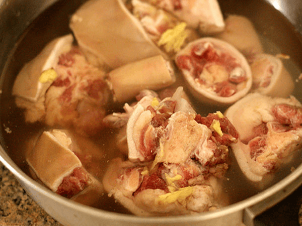 Ướp đuôi bò trong 30 phút với gừng, nước mắm, hạt nêm, ngũ vị hương, rượu vang đỏ, sốt cà chua, và đường.