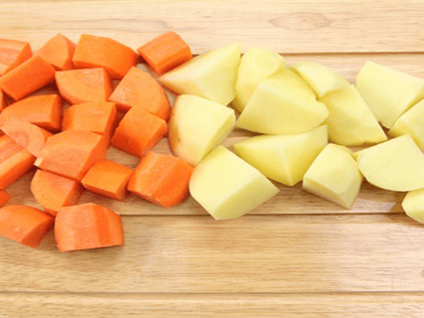 Cà rốt và khoai tây sau khi gọt vỏ và rửa sạch, hãy cắt thành những miếng vuông vừa ăn.