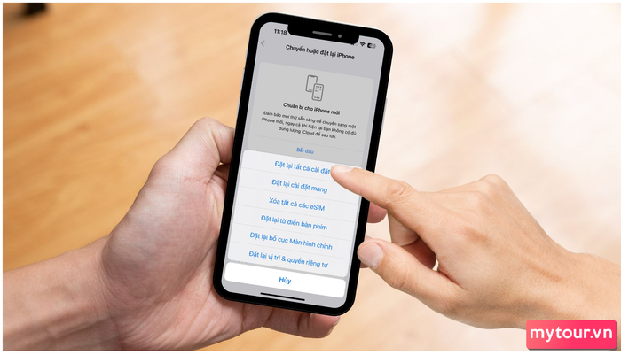 Trước khi thực hiện bước này, hãy đảm bảo sao lưu dữ liệu quan trọng vì việc khôi phục cài đặt gốc sẽ xóa hết dữ liệu cá nhân và đưa máy về trạng thái như khi mới mua. Để khôi phục cài đặt gốc iPhone, vào Cài đặt >> chọn Cài đặt chung. Sau đó, kéo xuống, vào Chuyển hoặc đặt lại iPhone >> Đặt lại và nhấn Đặt lại tất cả cài đặt.