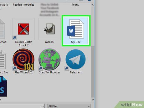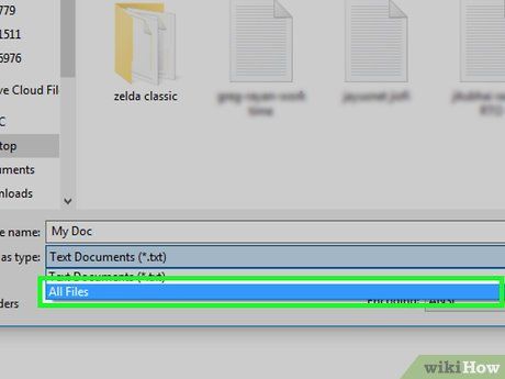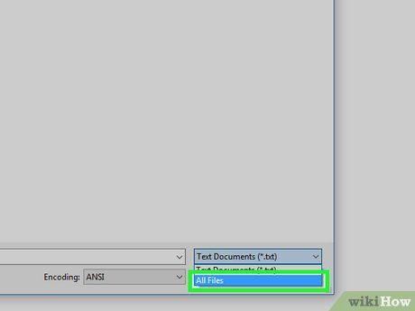 Chọn All Files (Tất cả tập tin) từ trong trình đơn thả xuống. Tùy chọn này thường nằm ở góc dưới bên phải của trình duyệt tập tin và thường mặc định là Text Documents (*.txt).
